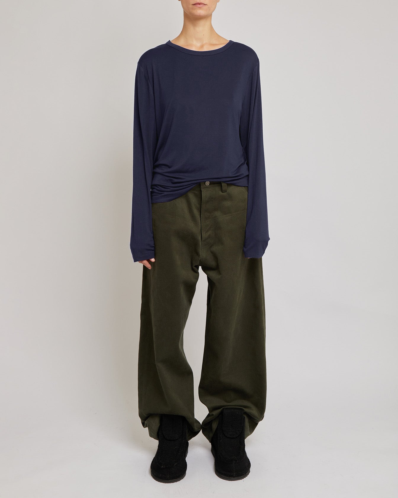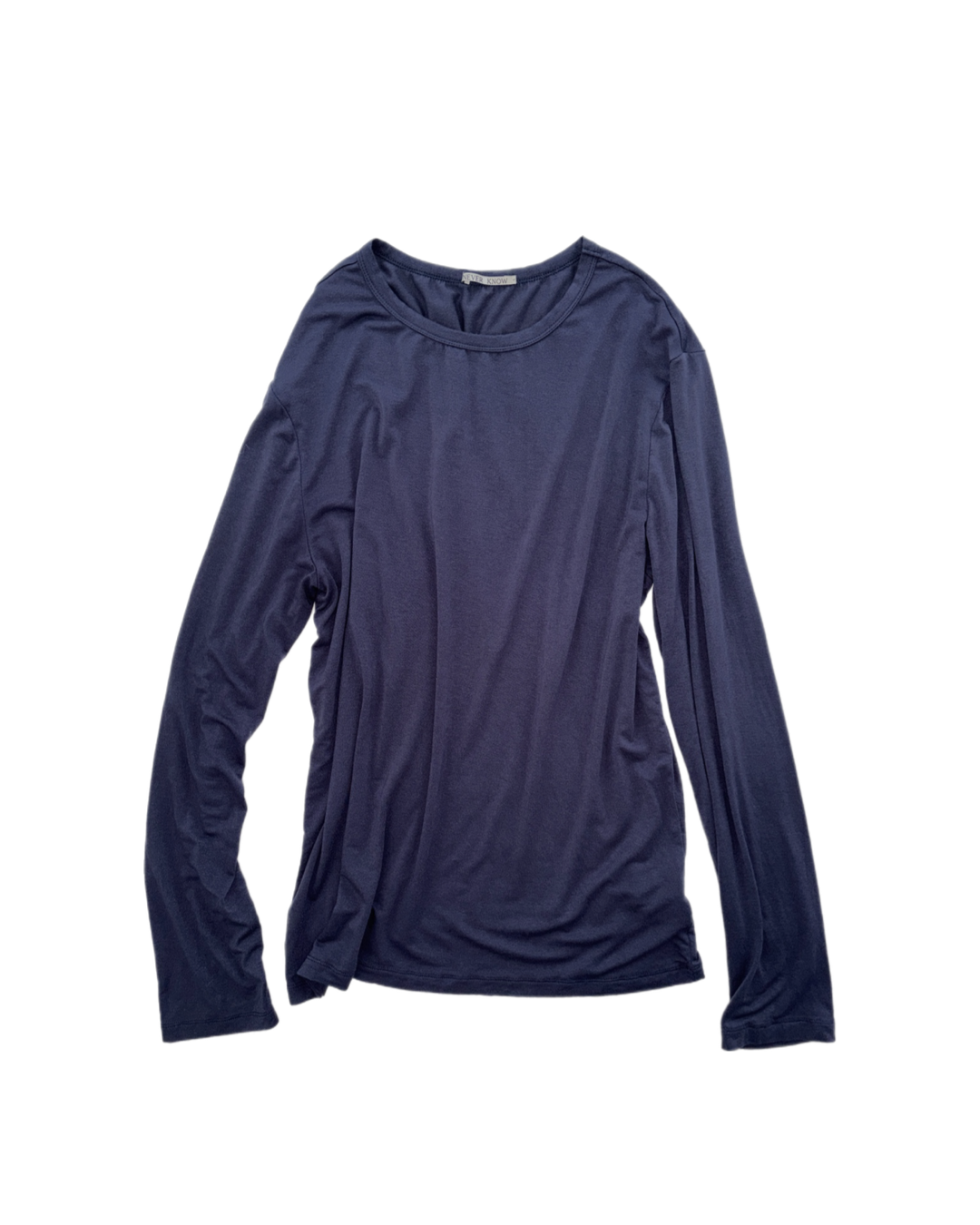 スモーキーネイビーのロングスリーブは、柔らかく通気性に優れたレーヨン混紡素材を使用し、程よいストレッチ性を備えています。動きやすさと快適さを追求したデザインで、ぴったりとフィットしながらもゆったりとした着心地と長袖、そして光の加減で微妙に変化する落ち着いたネイビートーンが特徴です。